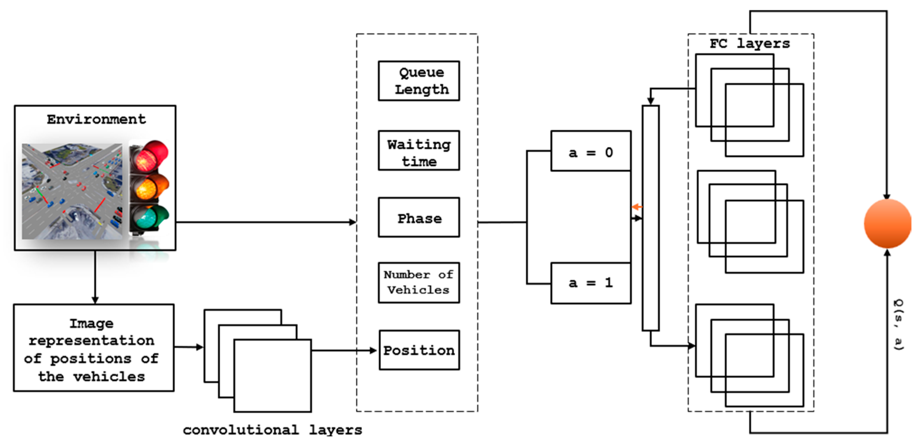 - Liang, X.; Du, X.; Wang, G.; Han, Z. A Deep Reinforcement Learning Network for Traffic Light Cycle Control. IEEE Trans. Veh. Technol. 2019, 68, 1243–1253. [Google Scholar] [CrossRef]