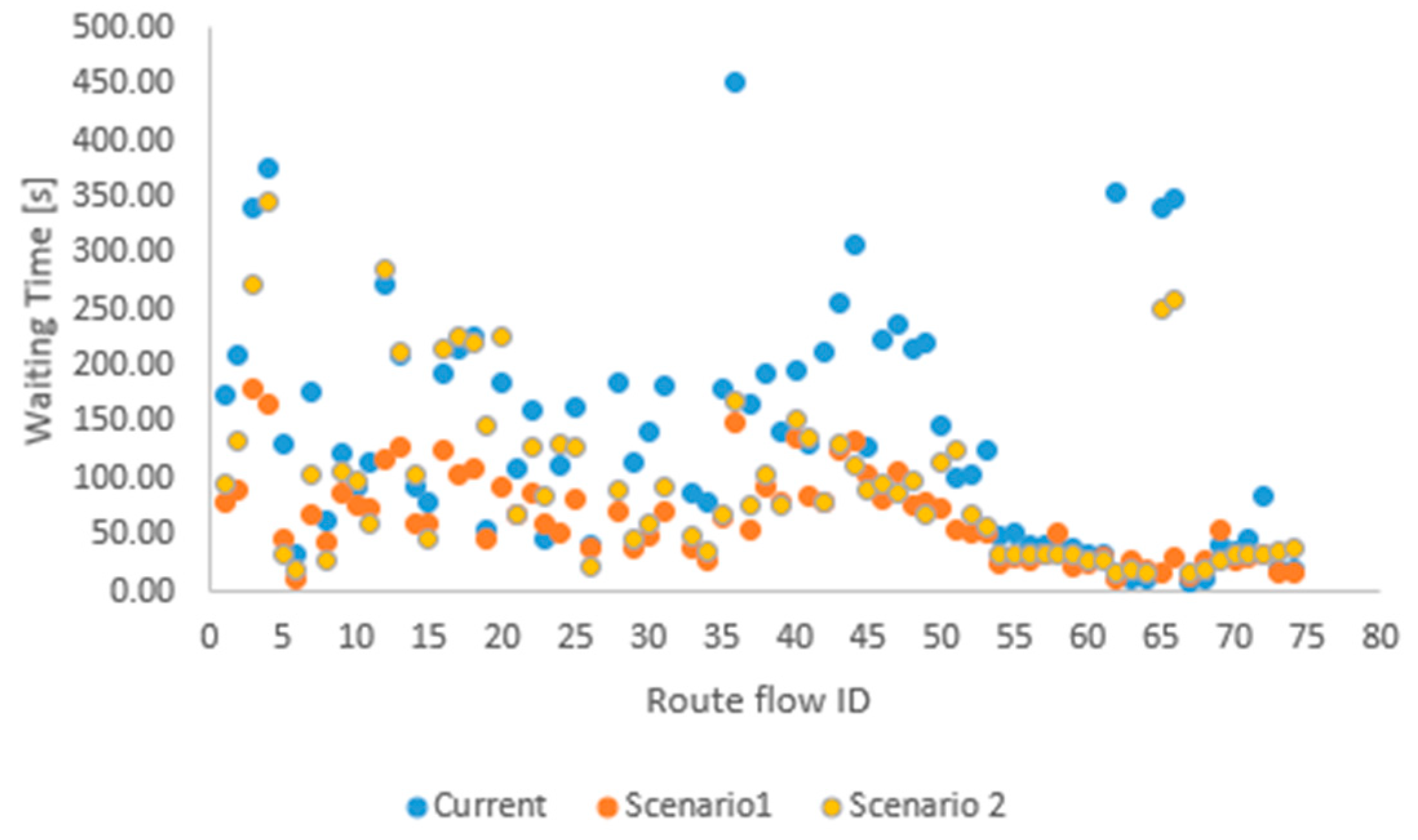 - The sum of waiting time is the sum of the waiting time of private vehicles across all lanes approaching the intersection ().