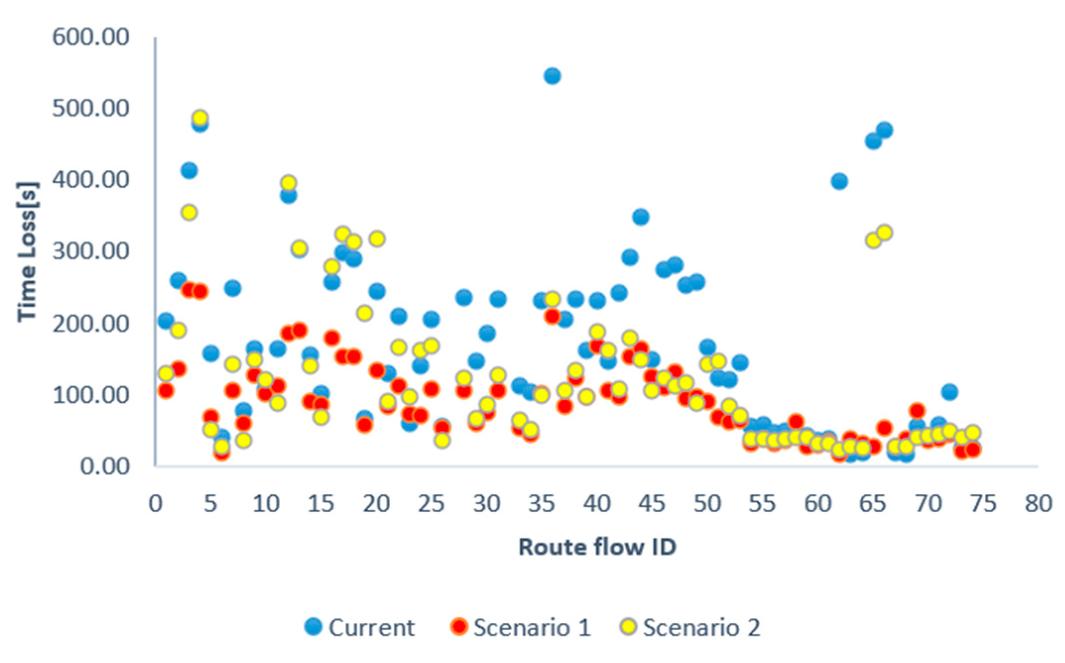 Intersection | Current [s] | Scenario 1 [s] | D1 [%] | Scenario 2 [s] | D2 [%] |
