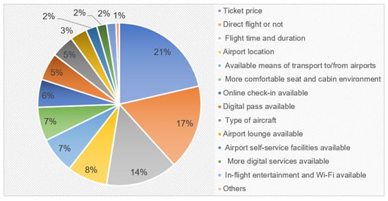 Passengers’ travel behavior has a deep impact on the air transport industry’s strategy development and decision-making processes. Analyzing the primary factors influencing flight selection is the first step in understanding older passengers’ travel behavior, as illustrated in Figure 3.