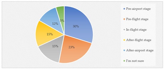 In the pre-airport stage, most digital air travel tools used by passengers are mobile phone based. Consequently, there may be differences between the TAM results for the pre-airport stage and the pre-flight stage, as this stage includes a greater variety of in-airport digital facilities rather than just mobile-phone-based tools. Table 7 presents the results of passengers’ behavior in completing pre-flight activities. Participants could select more than one answer for each question.
