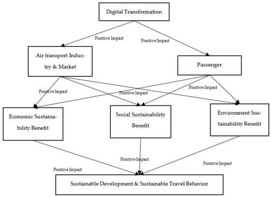 Furthermore, the growing number of digital users will contribute to a reduction in aviation waste and improved process efficiency, enhancing environmental sustainability in the air transport industry and society by improving waste management and reducing environmental impact. Thus, the digital impact not only enhances older passengers’ travel experiences but also strengthens the air transport industry’s viability. Ultimately, the sustainable travel behavior of passengers and the air transport industry’s sustainable operations will contribute to shared sustainability development, as illustrated in Figure 8.