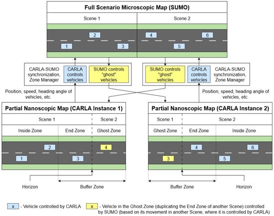 To resolve this problem, the concept of Buffer Zones is proposed. If a vehicle enters a Buffer Zone, it is duplicated and then exists in multiple scenes at the same time, maintaining its parameters (speed, acceleration, steering angle, etc.) in all scenes where it appears, being controlled by the scene (CARLA server) it currently belongs to. Figure 2 describes the Buffer Zone concept and the proposed parallel nanoscopic simulation approach in detail, emphasizing the handling of vehicle control by CARLA and SUMO.