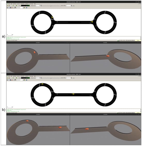 To implement the parallel simulation with two CARLA and one SUMO instances, it is necessary to modify the existing synchronization architecture, including the CARLA-SUMO bridge, by expanding its capabilities for managing a list of CARLA objects. In the initial version of the program used to implement the prototype, only part of the CARLA-SUMO bridge capabilities is used. The bridge’s code is extended, with a method that encompasses the main simulation loop performing the sumo.tick(), filtering vehicle representations in SUMO by their belonging to a specific map zone, and then sequentially calling the carla.tick() for each CARLA instance. This way, each CARLA instance receives control over those agents that are within its area of responsibility. Otherwise, general synchronization logic remains the same as in the original implementation of the CARLA-SUMO bridge. This architecture allows scaling the nanoscopic simulation by performing it for several map sections in parallel, and at the same time maintaining the centralized oversight by SUMO. The demonstration of an operational implemented solution is shown in Figure 5a,b.