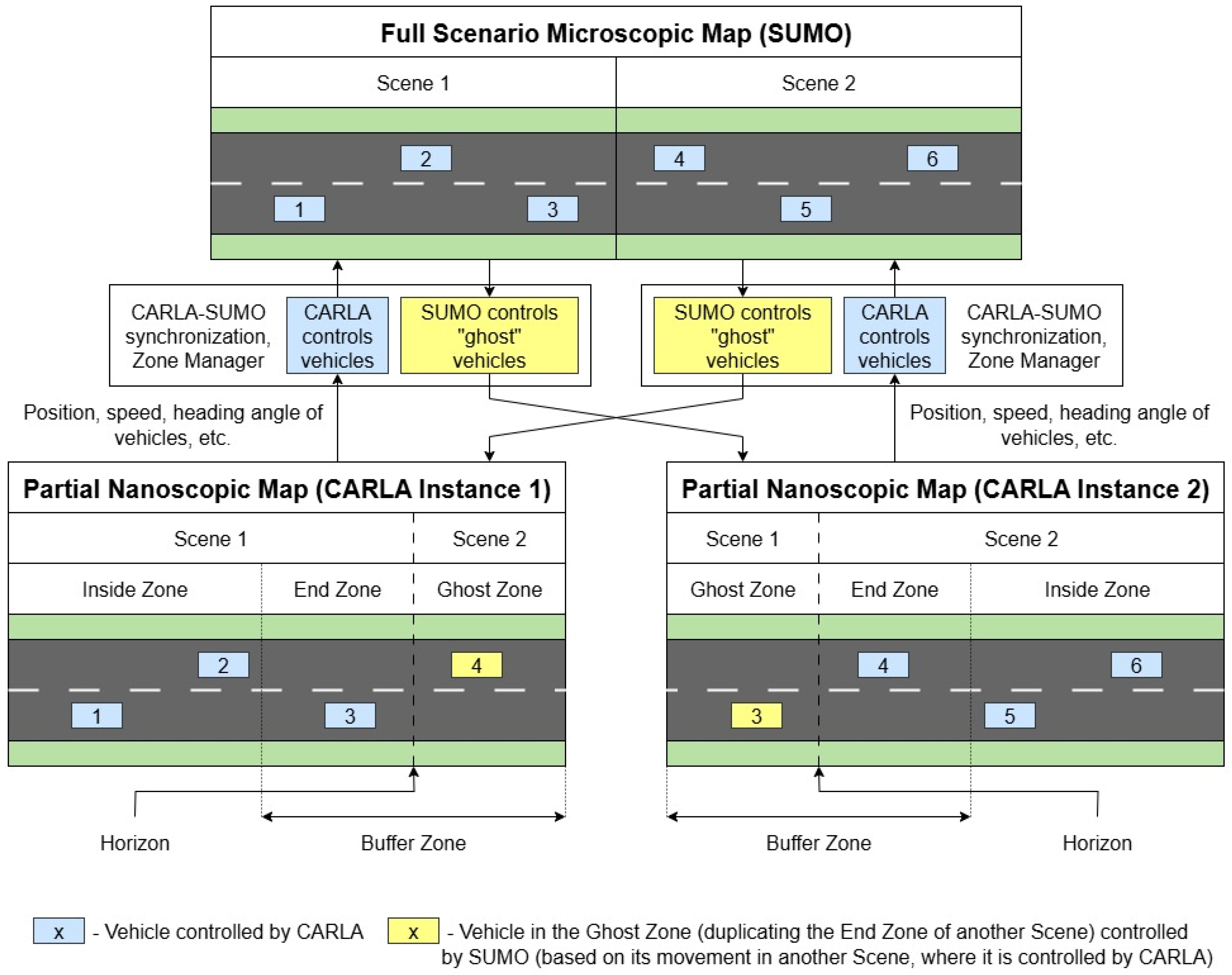 - Approaches to load balancing for CARLA servers used to handle nanoscopic scenes and CARLA clients controlling the agents in the traffic scenarios should be studied. Notably, it is assumed that traffic can change significantly for each partition of the map at the nanoscopic level of simulation. Therefore, load balancing cannot be based on network size and traffic intensity as in microscopic simulations.