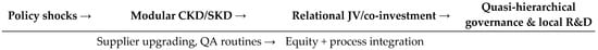 Building on Gereffi–Humphrey–Sturgeon [], the cooperation has progressed from modular (CKD/SKD import assembly with codified specs), to relational (co-investment, co-design of processes, localized supplier development), and into emerging hierarchical/captive elements (equity control, in-house standards, plant-level R&D). Key triggers: (i) policy instruments (public procurement localization, recycling incentives), (ii) equity ties (JAC/CMC–Allur, Chery–Astana Motors industrial park), (iii) capability formation (paint/weld shops; component lines).