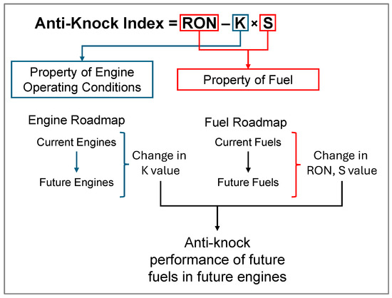 This paper applies a standard technology roadmapping approach, assessing changes in engine technology and fuel properties in parallel while considering market trends and policy influences [19]. These advances are integrated through Equation (2), as shown in Figure 2. Changes in engine technology alter the knock-limited operating conditions, which in turn affect K values, while fuel trends modify fuel chemistry, resulting in new octane sensitivities.