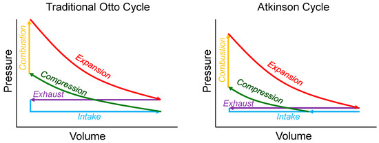 To further enhance efficiency, many small engines in hybrid vehicles employ Atkinson cycle principles rather than a conventional Otto cycle [26]. The Atkinson cycle is compared to the traditional Otto cycle in Figure 3. The Atkinson cycle achieves a higher effective expansion ratio by delaying the closure of the intake valve, which allows a portion of the air–fuel mixture to flow back into the intake manifold during the compression stroke. This results in a lower effective compression ratio while maintaining a longer expansion stroke, improving thermal efficiency and reducing pumping losses. The goal is to extract more useful work from each combustion cycle, improving fuel economy and lowering emissions without requiring significant hardware complexity. However, these benefits are traded-off with decreased engine performance especially high-load or high-speed conditions. As such, the Atkinson cycle is particularly well-suited for hybrid applications, where electric motors provide additional torque to offset the reduced power output at those conditions.
