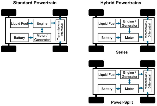 Standard vehicle powertrain (left) and hybrid powertrains (right). Hybrid powertrains are broadly classified as series or power-split.