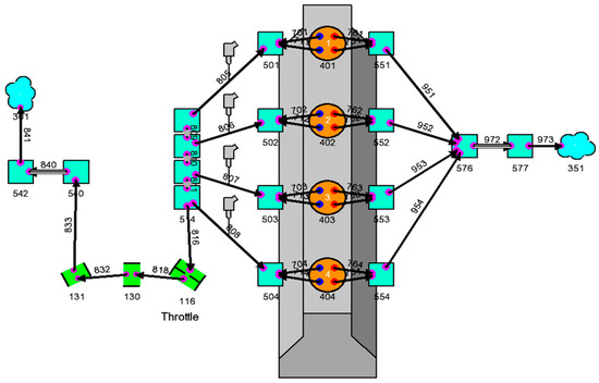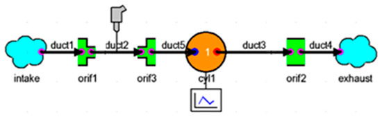 A similar WAVE model, shown in Figure 6, was developed for a standard four-cylinder naturally aspirated engine with a compression ratio of 10. An engine map generated from the model aligned well with maps for production engines [31]. Assuming an intake air temperature of 300 K, the model predicted the knock-limited range of operating conditions based on the pressure and temperature profiles in the engine. These conditions ranged from an intake air pressure of 0.8 bar at 1000 RPM to an intake air pressure of 1 bar at 3000 RPM, which matched the typical knock-limited range.