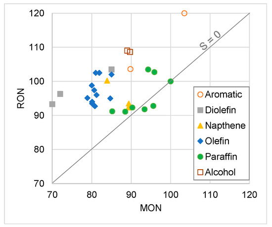 RON and MON for different pure chemical blends. Fuels along the diagonal line are not sensitive. As they move further away from that line, their sensitivities increase. Values for RON and MON taken from [46].
