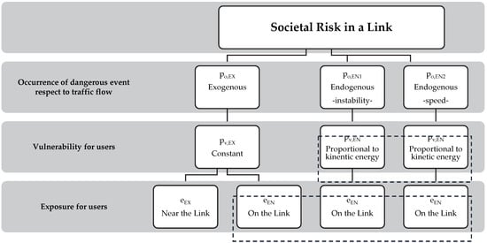 In a link, as indicated in Equation (8), societal risk is determined by three key components: occurrence, vulnerability, and exposure. In the specific case of a stable flow regime, these components can be expressed as functions of speed, which serves as the primary independent variable (within the assignment model framework):