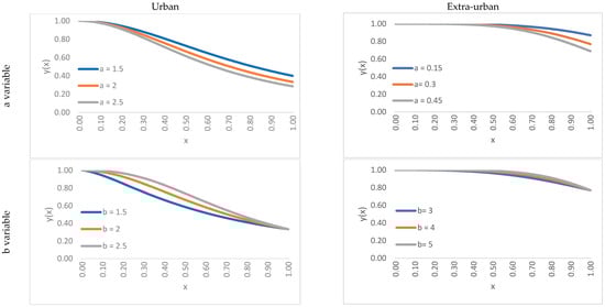 The first analysis compares the speed ratio values y() against the degree of saturation x considering different values of a and then of b in both urban and extra-urban settings (as shown in Figure 2). It is important to remember that since y() is not a function of c, it is useless to study the effect of changing such a parameter.