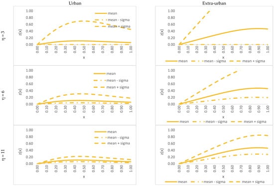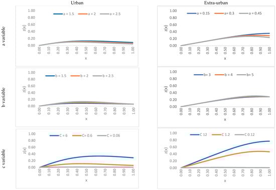 The second analysis compares the risk index values z() against the degree of saturation x in urban and extra-urban settings considering different values of a, b, and c (as shown in Figure 3); in any case z() against x shows a concave graph. Whatever the setting changes, both the parameters a and b have negligible effects. On the other hand, the effect of changing parameter c is very significant.