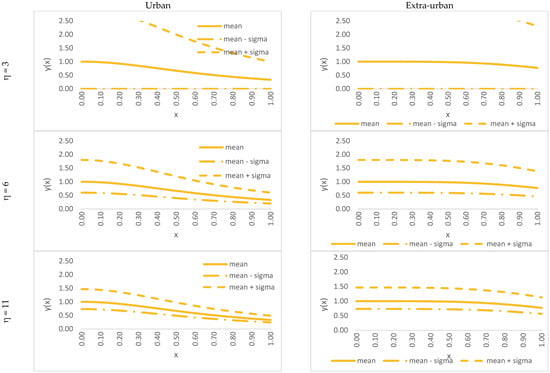 As expected, the larger the values of the shape parameter, the smaller the uncertainty interval. Figure 5 shows that the risk index is more sensitive to the degree of saturation and that uncertainty intervals are larger for the extra-urban setting with respect to urban ones. Lower η values yield wider intervals, indicating greater uncertainty in risk estimation. This has practical implications for traffic management: conservative measures may be warranted when uncertainty is high.
