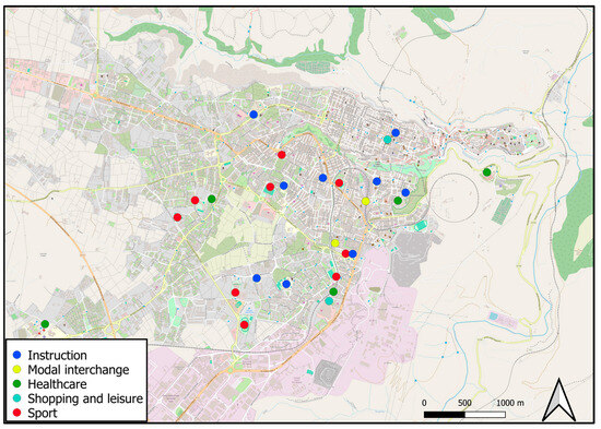 The choice of activities is primarily related to the evaluation of the type of afternoon activities that users can engage in, with reference to the school and sports facilities widely distributed in the destination urban area. Both instruction and sports services were rarely available in the users’ municipalities of origin. For shopping, three medium-to-large commercial areas were identified. Hospitals and other health facilities present in the area were indicated as potential destinations for non-emergency healthcare trips; some of them have dedicated stops. Finally, the two modal interchange hubs (bus station and train station) offer the possibility of reaching the region’s airports and larger cities. The activities in the study area are represented in Figure 3.