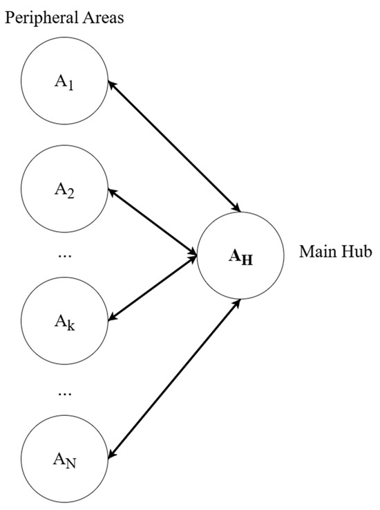 The work focuses on the modelling of a point-to-point DRTs connecting several peripheral areas to a central area. The study area is divided into a main hub, AH, and several peripheral zones, A1, A2, …, Ak, …, AN. The service connects each peripheral zone with the main hub, and vice versa.