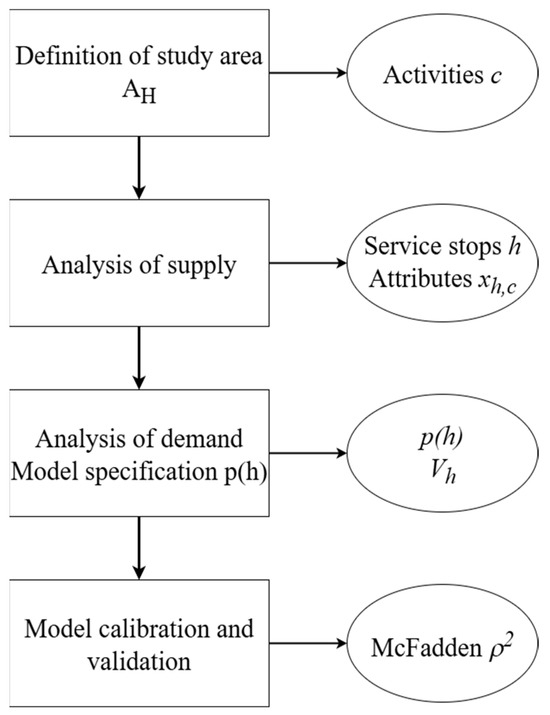 To evaluate the attractiveness of a specific class of activities and correlate it with user choice, gravity models can be used. Gravity models are widely used in the study of transportation demand, as they allow for the expression of relationships between system attributes and user choice; this relationship is expressed in terms of attractiveness parameters (positive) and impedance parameters (negative) [14,49]. The proposed model can be classified as a logit model in a gravitational form, in which the utility of each stop can be expressed as a linear combination of the attractiveness of the activities located in its proximity.