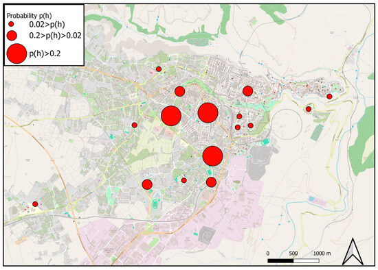 The z-values indicate that some relationships are statistically significant—for example, for sports-related trips and (z = 7.49, p < 0.01), suggesting that certain variables do exhibit significant associations despite the overall low correlations. The result for the McFadden suggests a good fitness value for the proposed calibration. Figure 6 shows the values of probability among different stops. The stop choice probabilities then focus on three stops, each of which has a choice probability greater than 0.2.