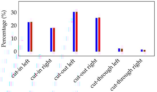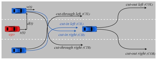 Overview of the six considered maneuver types: cut-in, cut-out, and cut-through, each to the left and right.