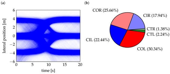 The dataset contains labeled trajectories, as shown in the heatmap of measured lateral position combining all six scenarios in Figure 2a. On German highways, the different maneuver types do not occur equally often, as the frequency of occurrence in Figure 2b demonstrates. In order to obtain a correct risk assessment [], the intended generative model has to reflect this probability distribution, which is why it is implicitly included in the aggregated data in Figure 2a used for training the unified generative model. This can be better observed in Figure 3, presenting individual heatmaps of measured lateral position for each scenario type, where the number of trajectories is different for different scenario types. Additionally, a representative trajectory is overlaid to illustrate typical maneuver characteristics. These separate scenario data subsets are used to train individual generative models for each scenario type. For illustration purposes, we show only the lateral position, but the models are trained using both lateral position and longitudinal velocity , as defined in Equation (3).