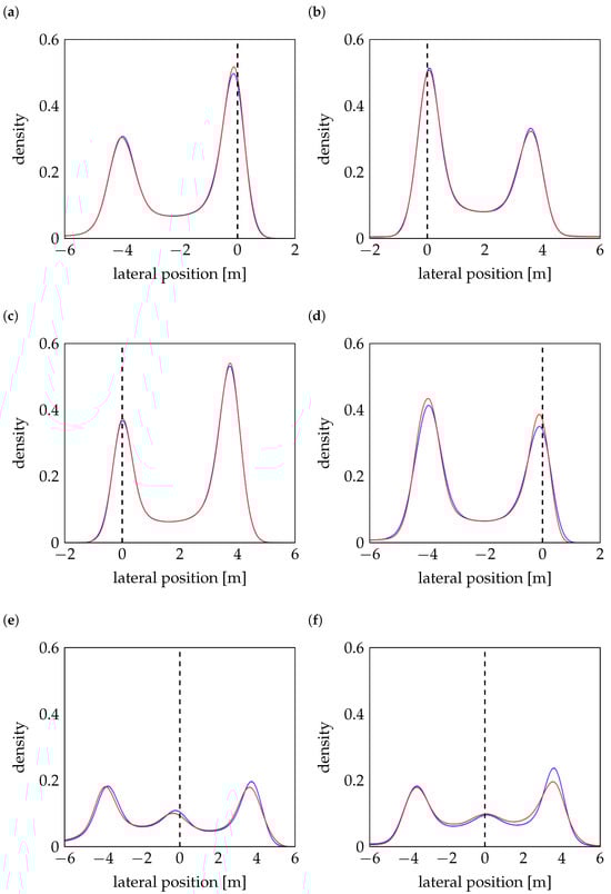 Comparison between KDEs of measured (blue) and generated (red) maneuvers for (a) cut-in left, (b) cut-in right, (c) cut-out left, (d) cut-out right, (e) cut-through left, and (f) cut-through right.
