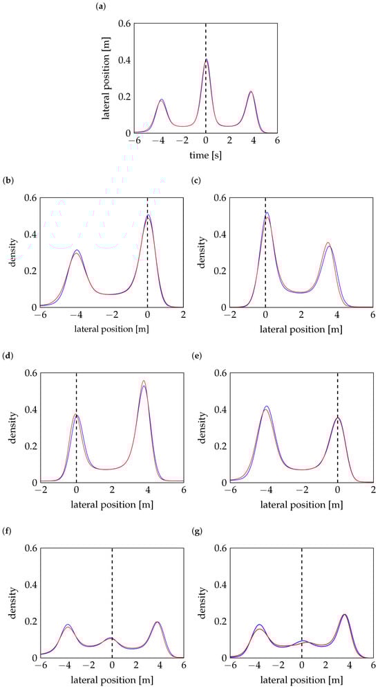 KDE comparison of (a) the whole set of generated trajectories and (b–g) subsets related to (b) cut-in left, (c) cut-in right, (d) cut-out left, (e) cut-out right, (f) cut-through left, and (g) cut-through right maneuvers.