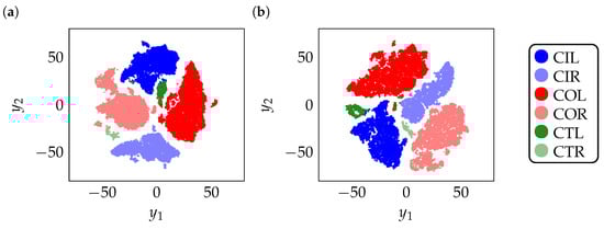 This property can be further examined by investigating how maneuver classes are organized in the latent space. To visualize this, a t-distributed stochastic neighbor embedding (t-SNE) [,] projection is applied to the ten-dimensional latent space , reducing it to a two-dimensional representation, as shown in Figure 9. Six distinct clusters corresponding to the six maneuver types can be clearly observed. Notably, cut-in and cut-out maneuvers form clearly separated clusters even across direction-specific variations. The cut-through maneuvers, which inherently combine features of both cut-in and cut-out, appear between these clusters, indicating their intermediate nature.