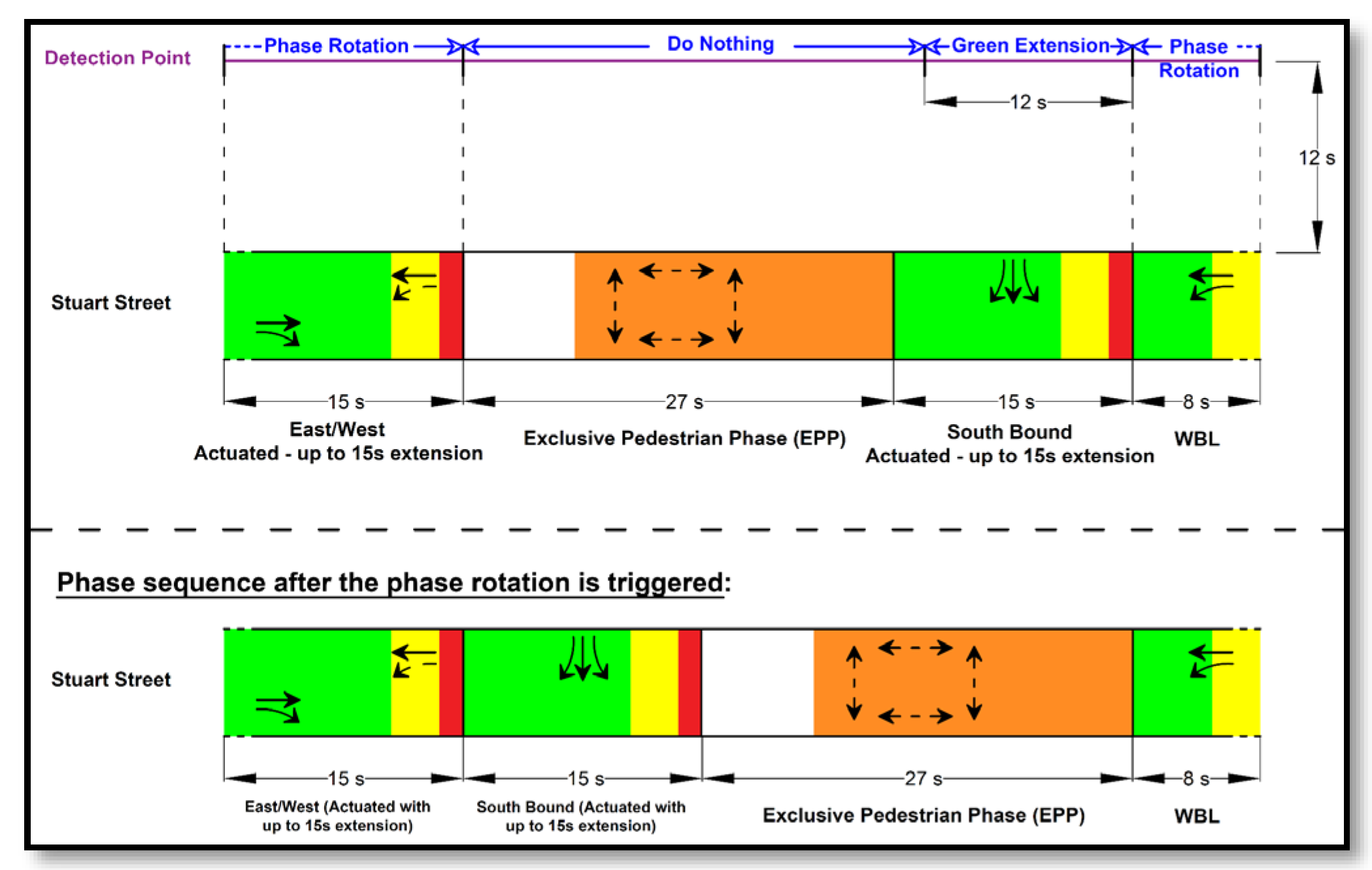 Figure 6 shows the proposed timing plan for the Stuart intersection in the normal sequence and with phase rotation. The sketch for the normal timing sequence also indicates the time intervals within which, when a bus that is 12 s away is detected upstream, GX and phase rotation are invoked.