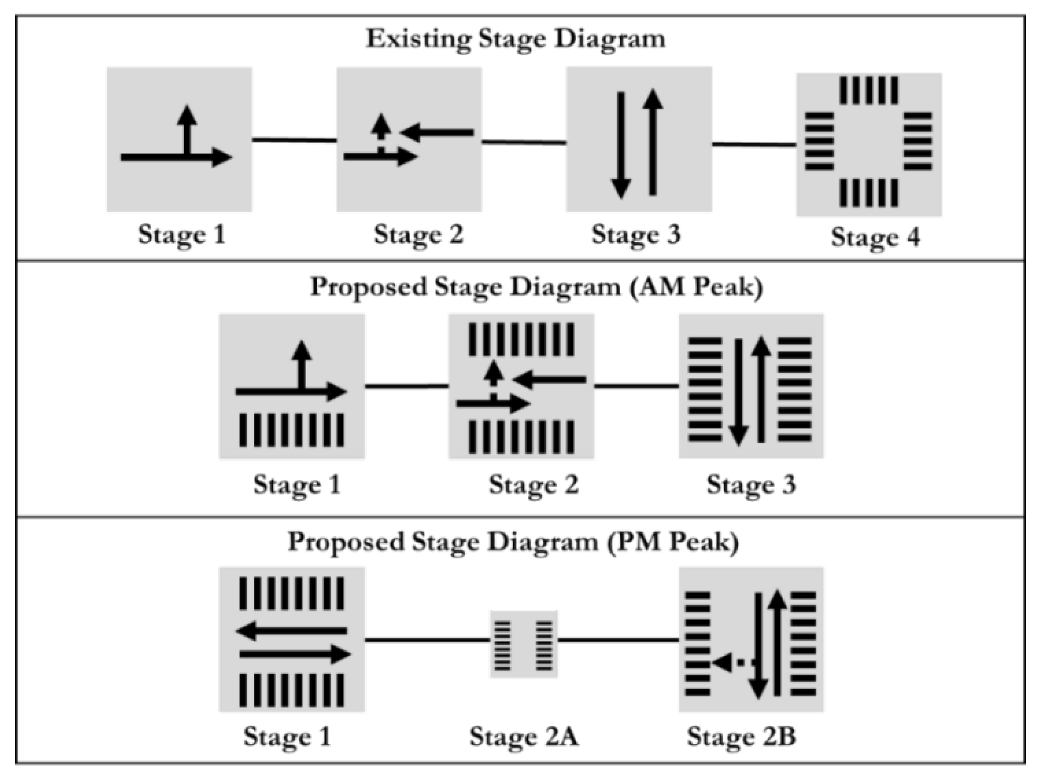 20]. In the AM peak, when eastbound left is the heavy turning movement, the leading eastbound phase was made long enough that only two permitted left turns per cycle would be made when pedestrians have a concurrent crossing. (It can also be noted that, during the early part of the pedestrian phase, when pedestrian activity is greatest, westbound traffic being released from its queue will effectively protect the pedestrians crossing from left turns.) In the PM peak, the low left turn volumes make a leading eastbound phase unnecessary; instead, to manage conflicts with the heavy right turn flow, a 4 s leading pedestrian interval (Stage 2A) is provided.