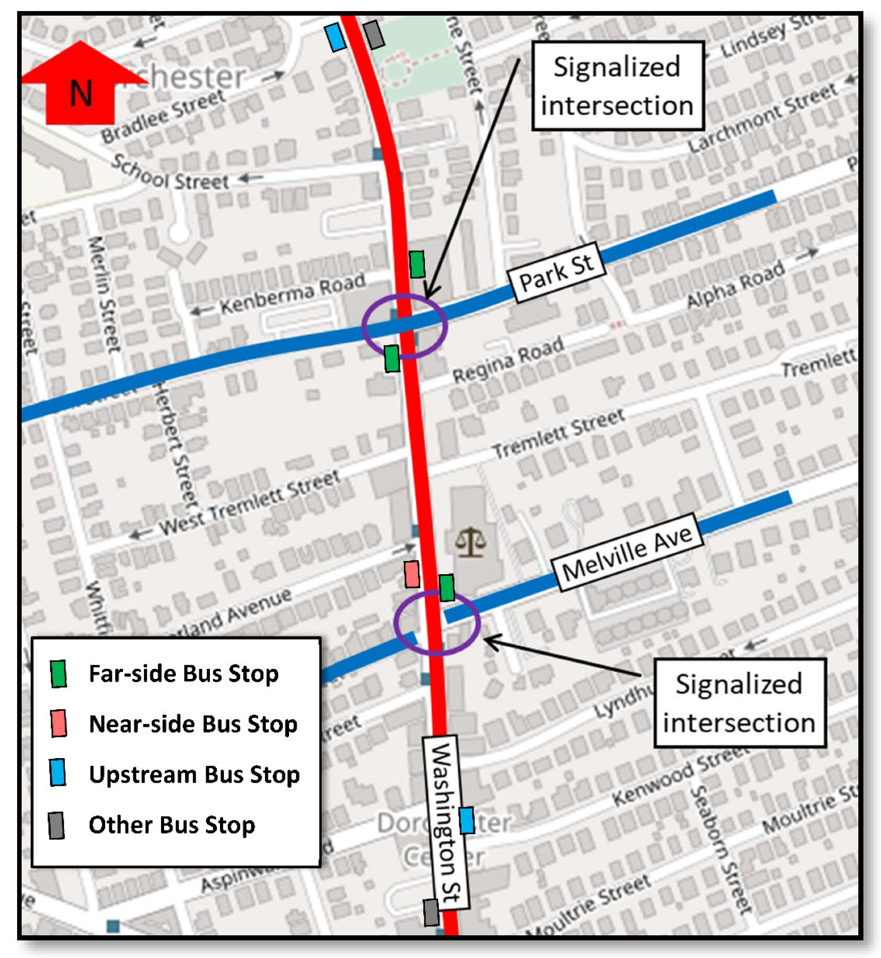 This site involves Route 23 buses in Boston’s Dorchester district traveling along Washington Street through signalized intersection at Park St. and Melville Ave. (