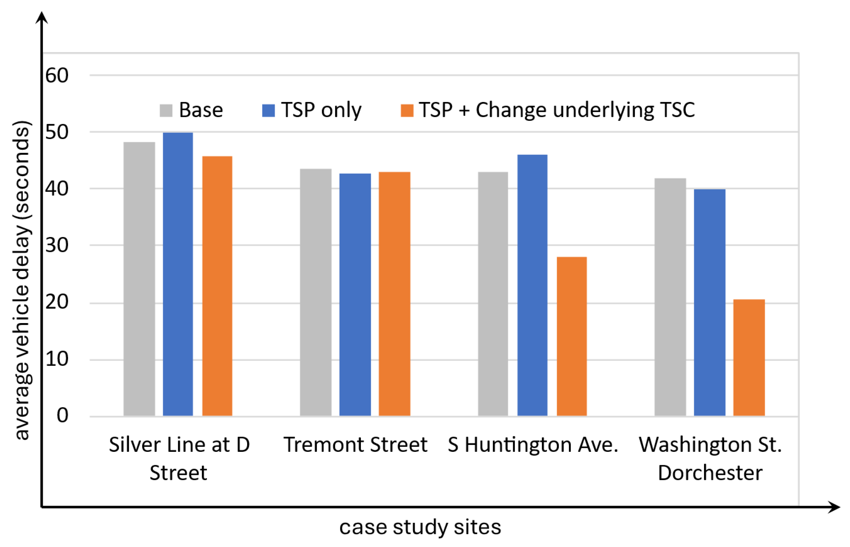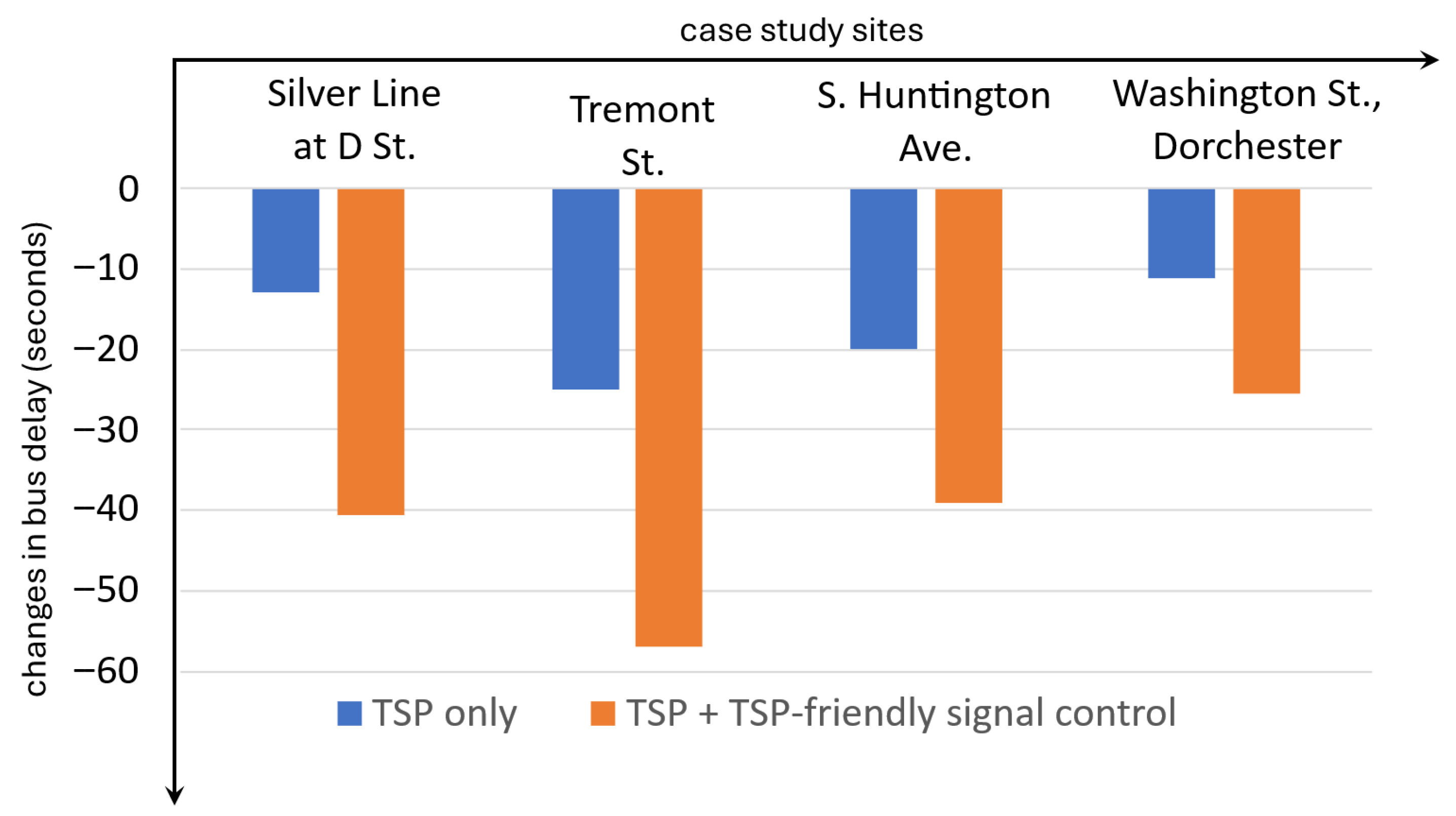 Figure 10 presents the same bus delay results but in a way that focuses on the change in overall bus delay relative to the before case. Changing underlying control at least doubles the delay reduction compared to applying TSP only.