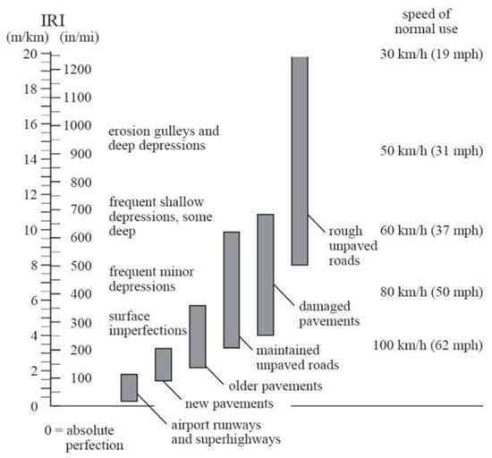 The IRI is the most widely used index worldwide to represent longitudinal roughness. It is a dimensionless parameter, generally expressed in m/km or mm/m, and can range from 0, for a perfectly smooth profile, to higher values associated with roads with reduced drivability, even at low speeds, as shown in Figure 1 []. Thanks to its stability over time and transferability across different contexts, the IRI has become a truly international standard (Alonso-Solorzano et al., 2023) [], with successful applications in both developed and developing countries (Barzegaran et al., 2022) [].