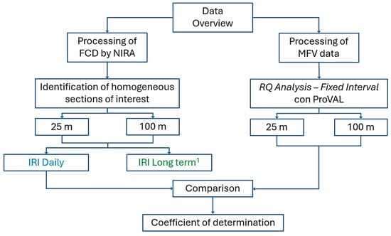 The data processing initially focused on exploring the information contained in the FCD, with the aim of assessing its reliability in representing the IRI indicator estimated using the standard methodology. The procedure was structured to ensure methodological consistency across the two case studies.