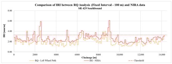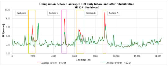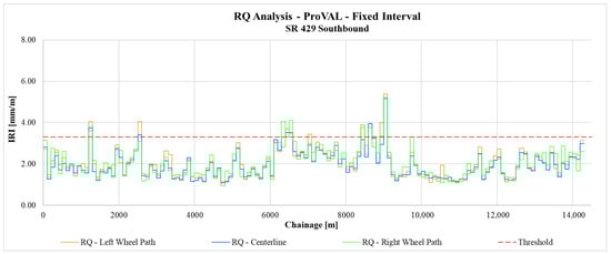 The spatial and temporal variability of the IRI was graphically represented, enabling a clear visualization of the impact of the maintenance works and the identification of areas with significant changes. Subsequently, the IRI values obtained from FCD were compared with those obtained from standard measurement instruments, resulting from data processing with ProVAL [], ensuring alignment using a common 100 m calculation base.