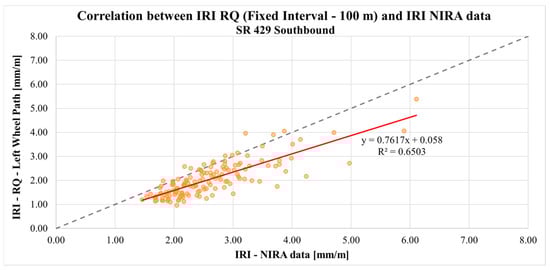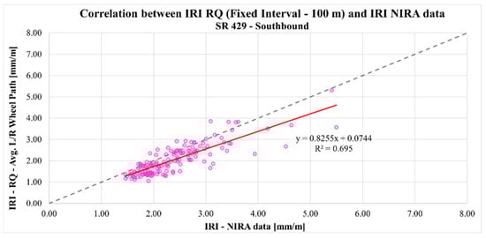 Supporting this approach, a recent case study conducted on a 112 km segment of Interstate-65 in Indiana demonstrated a strong correlation (R2 = 0.79, p < 0.001) between crowdsourced vehicle data and inertial profiler measurements, confirming the potential of this approach for large-scale monitoring of pavement conditions []. These results align closely with the aim of the present study, which leverages NIRA FCD to support network-level assessment and maintenance planning