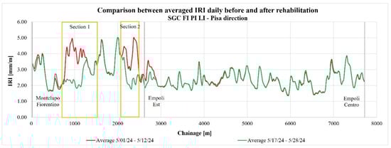The analysis began with the selection of two distinct observation periods: one prior to the rehabilitation works (before-rehabilitation) and one following them (after-rehabilitation), to assess the changes in pavement condition over time. FCD were then spatially aggregated at regular intervals (25 m and 100 m) to obtain average IRI indicators along the analyzed road sections. For the long-term evaluation, temporal smoothing techniques, such as the Kalman filter, were applied to better observe the trend evolution.