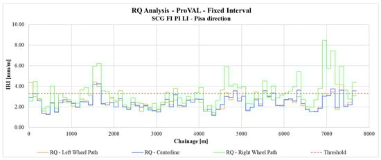 The processing of the profile, aimed at obtaining data comparable to the NIRA Dynamics database, was carried out through a Ride Quality Analysis using the ProVAL 4.0.60.0 [] software (FHWA), which provides the IRI along the examined alignment as output.