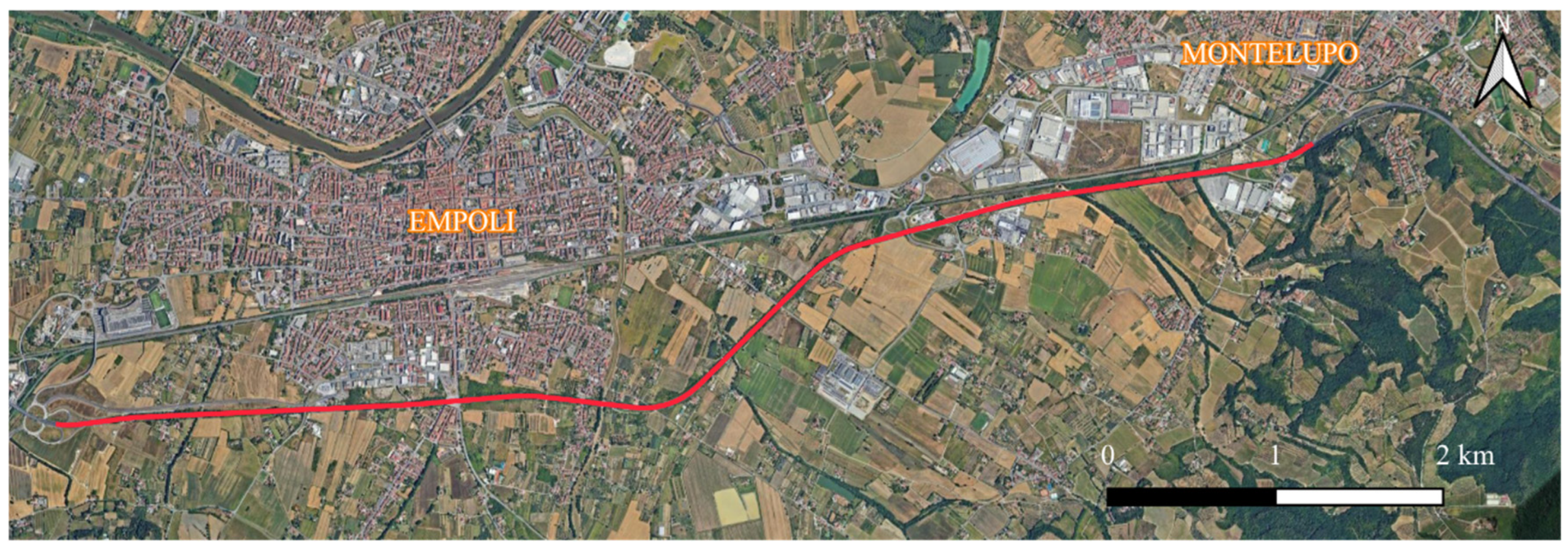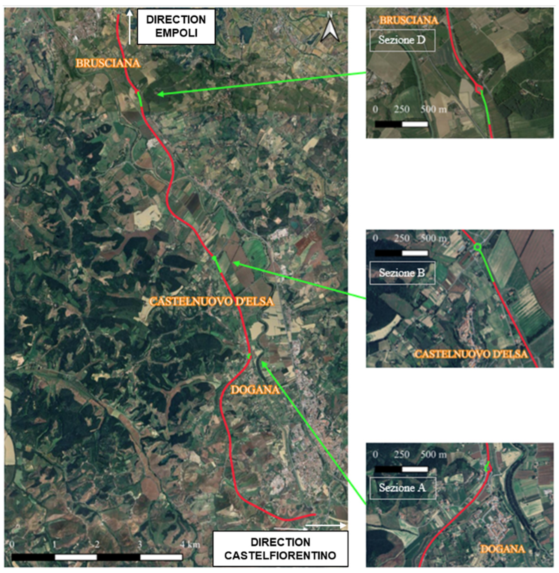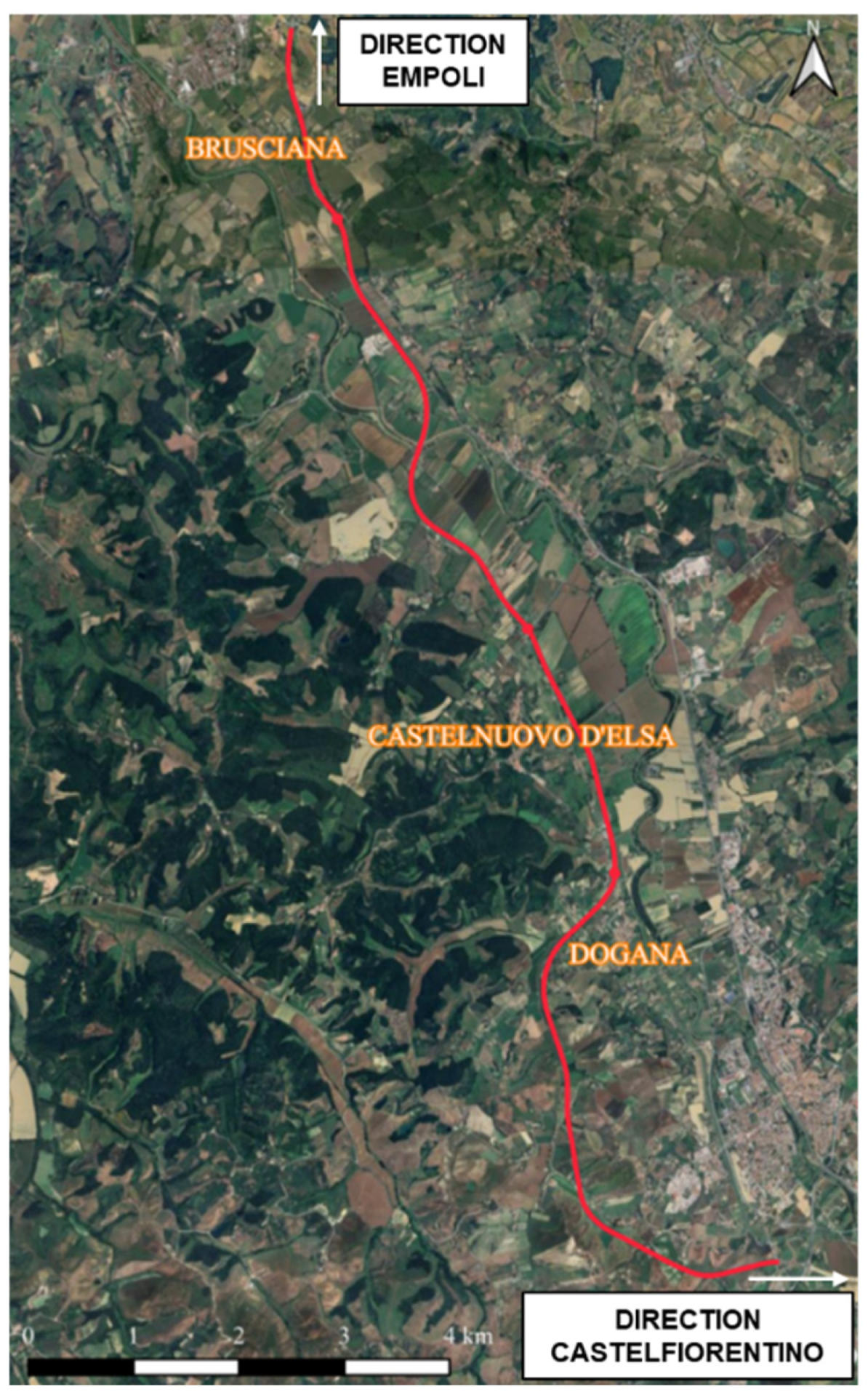 - Strada extraurbana Regionale 429 di Val d’Elsa (SR 429): a rural two-lane, two-way road with a single carriageway and one lane per direction, classified as functional class 2; according to DM 05.11.2001 [53], it is a C1 type.