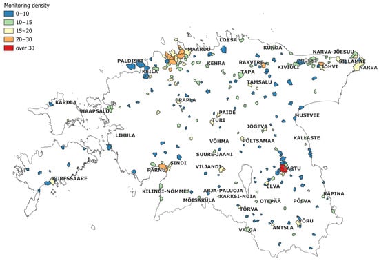 The spatial concentration of monitoring requirements varied significantly by location type. Cities (n = 47) averaged 23.4 monitoring points per cell, while small towns (alevik, n = 186) averaged 8.7 points per cell. Tallinn districts demonstrated the highest density, with Mustamäe averaging 30.0 points per cell and Kristiine 27.6 points per cell.