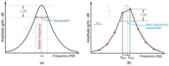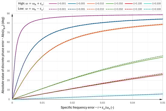 Finally, the (discrete) phase error (εϕ,d)—meaning the deviation between the phase value at natural frequency (ω = ωn) and the phase value at the next discrete frequency value (upper neighbor: ω = ωn + εω—see Figure 4)—can be expressed as follows: