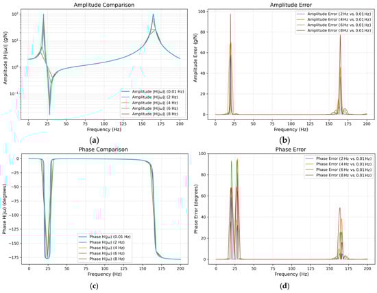 Effect of frequency resolution on the amplitude and phase accuracy of Frequency Response Functions (FRFs) of a 2-DOF system: (a) amplitude comparison; (b) amplitude error relative to the finest resolution; (c) phase comparison; (d) phase error relative to the finest resolution.