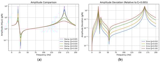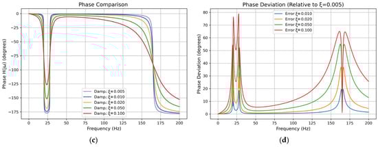 Effect of damping ratio (ξ) on the amplitude and phase of Frequency Response Functions (FRFs) of a 2-DOF system: (a) amplitude comparison; (b) amplitude deviation relative to ξ = 0.005; (c) phase comparison; (d) phase deviation relative to ξ = 0.005.