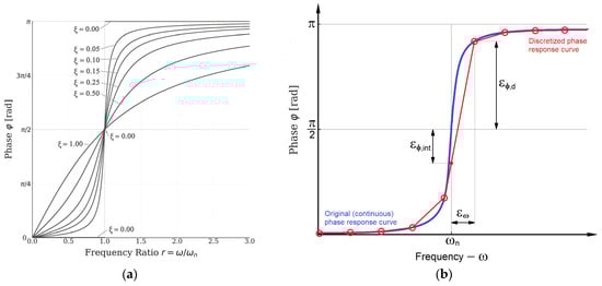 (a) Phase response of a 1-DOF system as a function of frequency ratio for different damping values []; (b) the visualization of phase error due to discrete frequency resolution.
