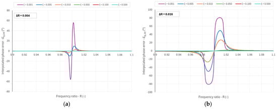 This phase error can be visualized as a function of R, for different damping ratio (ξ) and specific resolution (ΔR) values—see Figure 6.