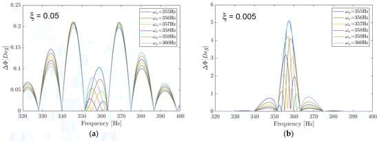The manifestation of this limitation is demonstrated in Figure 7, where the (interpolated) phase error is given for ∆ω = 11.7 Hz frequency resolution (with fixed frequency lines) for a damped, 1-DOF system with slightly shifted resonance frequencies. It is now obvious that the phase error is dependent on the coincidence of the natural frequency and the frequency lines of the used, discrete resolution. Moreover, the maximum phase error value is near the natural frequency only if the damping is low. An increased damping—e.g., 5% in the presented case—will result in phase error maxima further away from ωn. This finding is in accordance with the interpretation of Figure 6: the greater the damping, the further the phase error maximum is from the resonance frequency. The difference between Figure 6 and Figure 7 is that the former evaluates a continuous frequency scale (like a sliding window), while the latter calculates the error from the measured, discrete frequency lines (and linear interpolation between them).