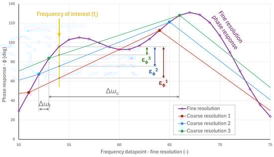 The next step is to determine the maximum phase error, i.e., calculating the phase differences between the fine resolution FRF and the 1st, 2nd … 10th rough resolution case at the examined fi frequency (εϕ1, εϕ2, … εϕ10)—as illustrated in Figure 8—and take the maximum of the phase error values.
