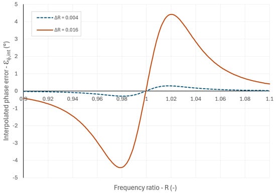 The interpolated phase error was calculated too around resonance with Equation (14), and the resulting curves are shown in Figure 11 for the medium (Δω = 2.9 Hz) and coarse (Δω = 11.7 Hz) resolutions. The former results in maximum εϕ,int = 0.3° at R = 0.981 (ω = 351.7 Hz), while the coarse resolution gives εϕ,int = 4.5° at R = 0.979 (ω = 351.0 Hz).