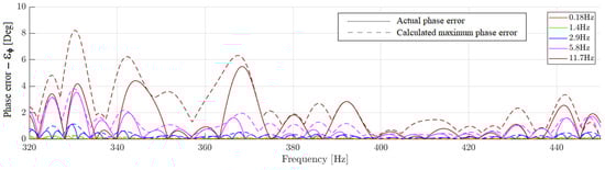 The deviation of the coarse resolution phase response values from the finest one (Δω = 0.05 Hz) is shown in Figure 12 with solid lines. The lower phase error in the narrow vicinity of the resonance frequency (358 Hz) is clearly visible—in accordance with Figure 6 and Figure 7. The maximum actual phase error for Δω = 11.7 Hz resolution is around 5.45° at 368.3 Hz. This value is somewhat larger than the error estimation from the interpolated error analysis, which is due to the deviation of the real system from a pure 1-DOF response (it can be seen evidently from the amplitude response in Figure 10 at around 370 Hz).