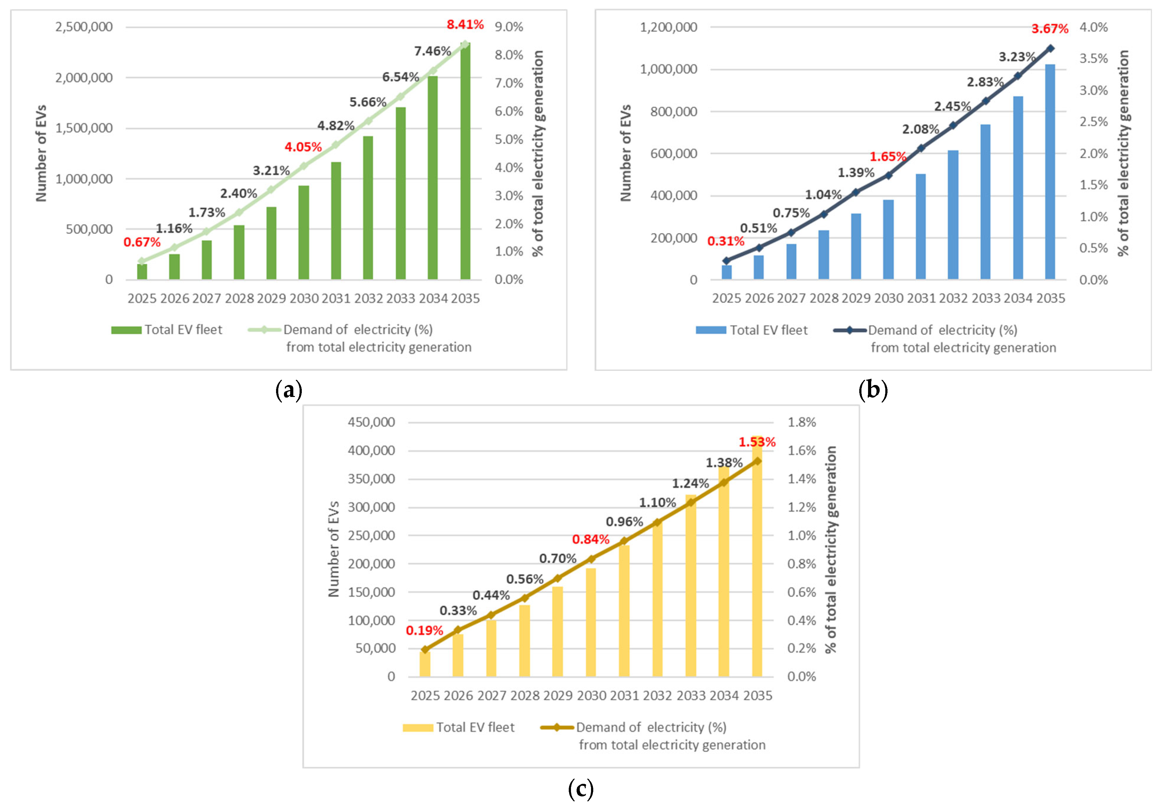 The total electricity consumption for each of the three EV fleet size scenarios (a, b, and c) for the 2025–2035 timeframe is shown in